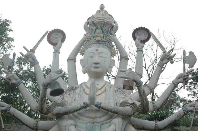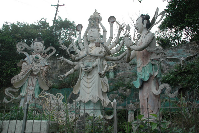 而在洞外,有一個水池,有著很大的一尊觀音像,不過自洞口封閉後,看來已經沒人保養,水池荒廢,年久失修