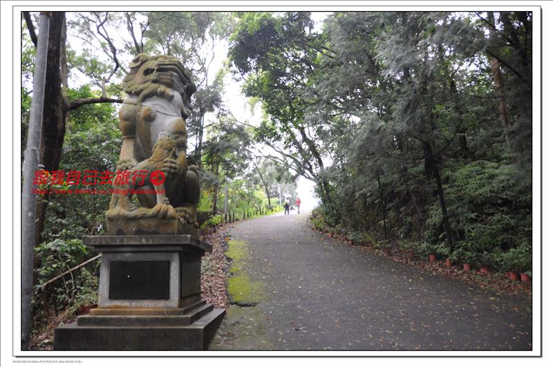 進入鐵門後,首先看見兩隻石獅子位於兩旁,這兩隻石獅子根據後方資料是在1993年設立的,以上面布滿青苔的情況來看,可以了解該地濕氣應該頗重,這條道路約30公尺,側邊有地下停車場入口,已經荒廢;另一旁則是樓梯口,我拾級而上,登梯入內!